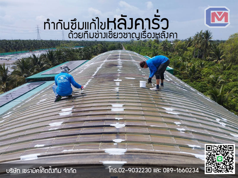 การซ่อมหลังคารั่วนั้น จำเป็นต้องมีการให้ช่างเข้าไปดูหน้างานเพื่อตรวจสอบ สาเหตุการรั่ว เพื่อการซ่อมแซมอย่างตรงจุด แก้ไขปัญหาได้อย่างมีประสิทธิภาพ ทำให้การทำงานเป็นไปอย่างสำเร็จตั้งแต่เริ่มแรก ต่อมาเมื่อรู้สาเหตุแล้ว จึงค่อยทำการแก้ไขตรงจุดที่หลังคารั่ว-ซึม หากมีกระเบื้องแตกร้าว ก็ต้องทำการเปลี่ยนใหม่ ตรวจสอบน็อตสกรูหมดอายุการใช้งานหรือไม่ หากหมดอายุการใช้งานแล้ว ควรเปลี่ยนให้เรียบร้อย ต่อมาทำความสะอาดหลังคา แล้วจึงทารองพื้น (Super Primer) ตามบริเวณที่จะทากันซึม เช่น รอยต่อของกระเบื้องหลังคา (แล้วแต่ชนิดหลังคา) บริเวณหัวน็อตสกรู ที่น้ำสามารถซึมผ่านเข้ามาได้ เมื่อแห้ง หรือสัมผัสแล้วไม่ติดมือ จึงทำการโค๊ต อะคริลิคโพลิเมอร์ (Acrylic Polymer) กันซึมชนิดพิเศษตาม เป็นอันเสร็จขั้นตอน หากแต่เป็นกระเบื้องซีแพค (C-Pac) จะมีการทำสีทับ ซึ่งจะเป็นสีที่ใกล้เคียงกับสีหลังคาเดิมให้ เนื่องจากอะคริลิคโพลีเมอร์ (Acrylic Polymer) จะมีสีขาว หากทาบนหลังคาที่มีสีแดง ก็จะตัดกันอยางเห้นได้ชัด จึงต้องมีค่าใช้จ่ายเพิ่มในการทาสีทับ แต่หากพ่นสีหลังคาใหม่ทั้งหมด ก็จะได้หลังคาที่เหมือนใหม่ ตามที่ลูกค้าต้องการ