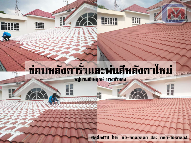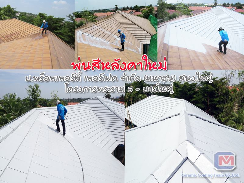 บริการพ่นสีหลังคา หรือ เปลี่ยนสีหลังคาใหม่ เป็นอีกหนึ่งบริการของเราที่ได้รับความนิยมใช้บริการเป็นอย่างมาก เนื่องจากรวดเร็ว สวยงาม เรียบร้อย ใช้สีหลังคาที่มีมาตรฐาน คุณภาพดีจาก TOA และ Bayer ให้ลูกค้าเลือกได้ตามต้องการ ราคาขึ้นอยู่กับสีที่ลูกค้าเลือก ใช้เวลาทำงานเพียง 1-2 วันหากมีแดดดีเพื่อให้เคมีเซ็ทตัวได้อย่างรวดเร็ว นิยมพ่นสีหลังคาใหม่หลังจากการทำกันซึมซ่อมหลังคารั่ว ในหลังคาประเภทซีแพคโมเนียเต็มพื้นที่ และหลังจากการพ่นฉนวนกันความร้อน พียูโฟม ด้านบนหลังคา เพื่อป้องกันหลังคารั่วและร้อน ในกรณีที่หลังคาไม่สามารถทำกันซึมได้ การพ่นโฟมบนหลังคาทำให้ต้องมีการพ่นสีหลังคาทับเพื่อความสวยงาม